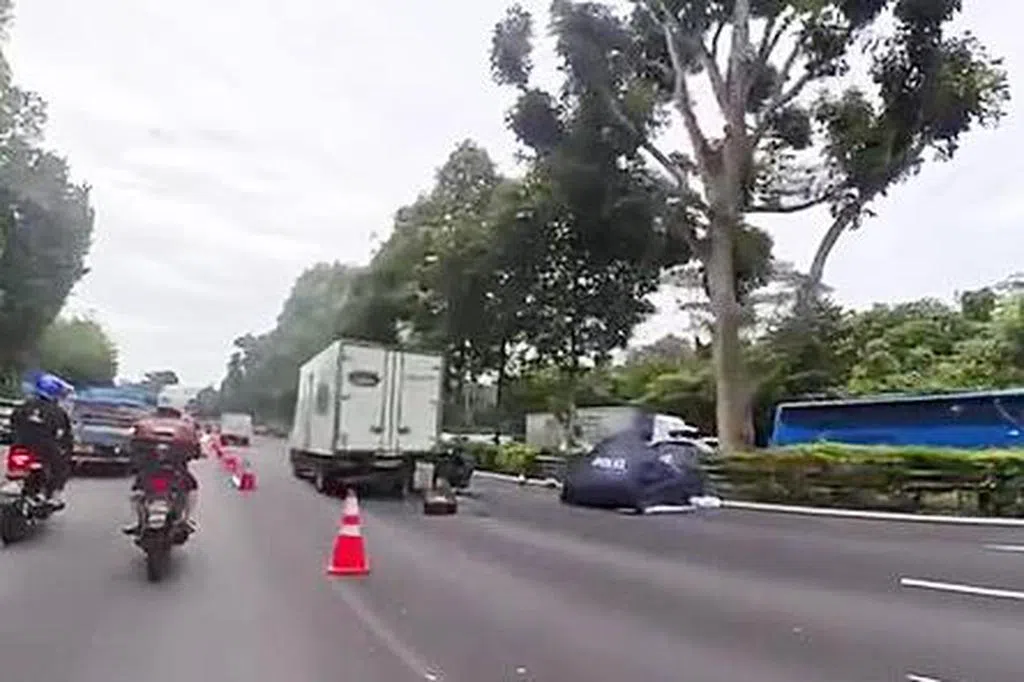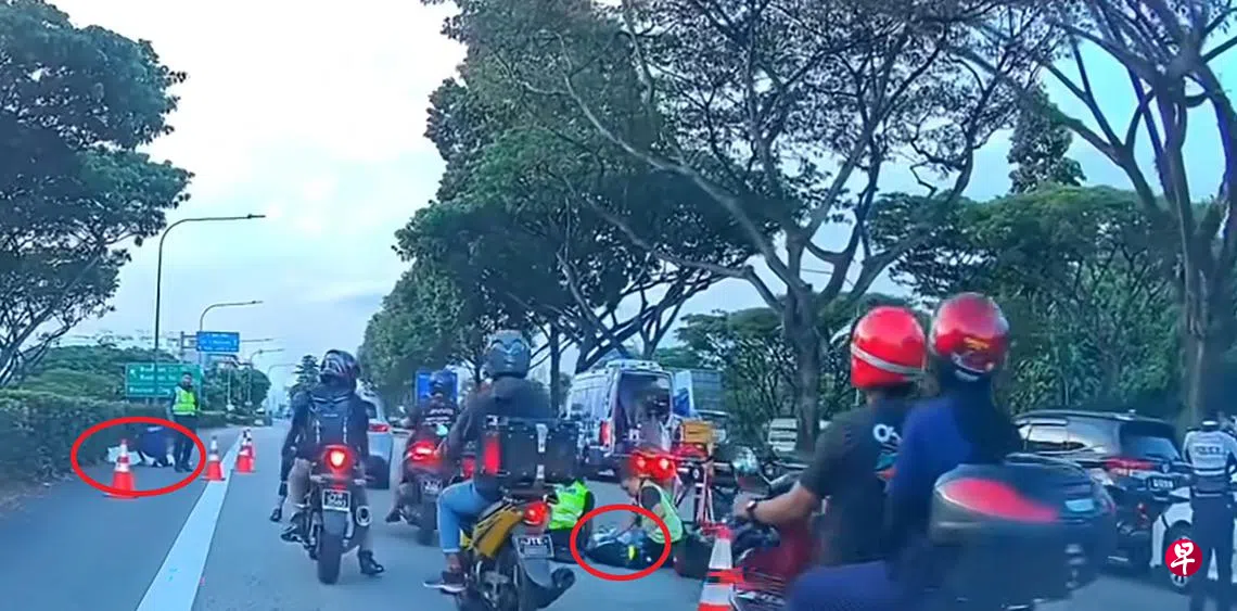 根据网上流传的视频,救护车到场,警方封锁了右边两条车道,剩下左边一条车道通行,路过的汽车和电单车都只能缓慢通过。