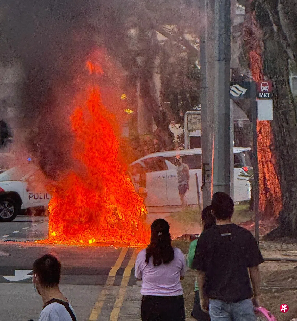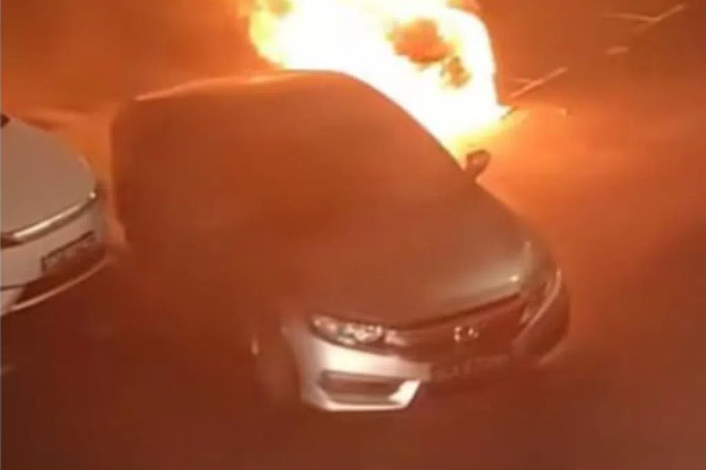 根据《联合早报》读者提供的画面,一辆汽车在布莱德岭民众俱乐部附近起火燃烧,烈焰伴随着黑烟,引起路过民众围观。现场也来了警车。