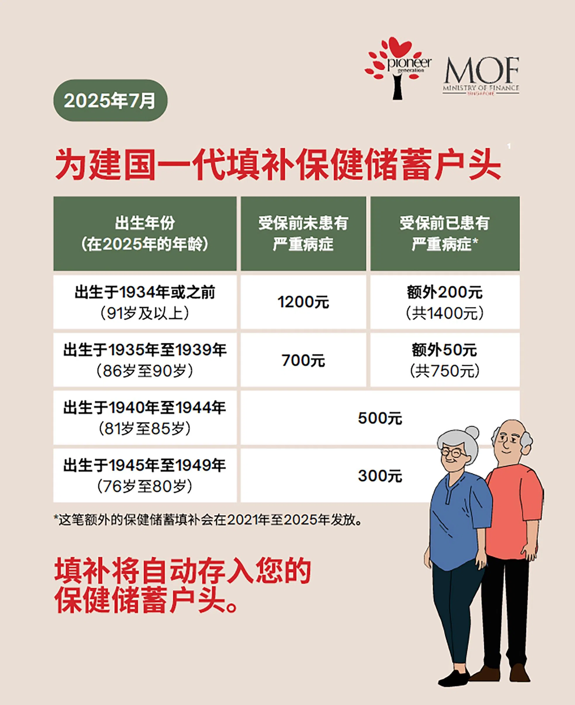 约30万名建国一代年长国人将在今年7月获得保健储蓄(MediSave)填补。患有严重潜在疾病的年长者,将额外获得高达200元的填补,以协助支付他们更高的终身健保保费。