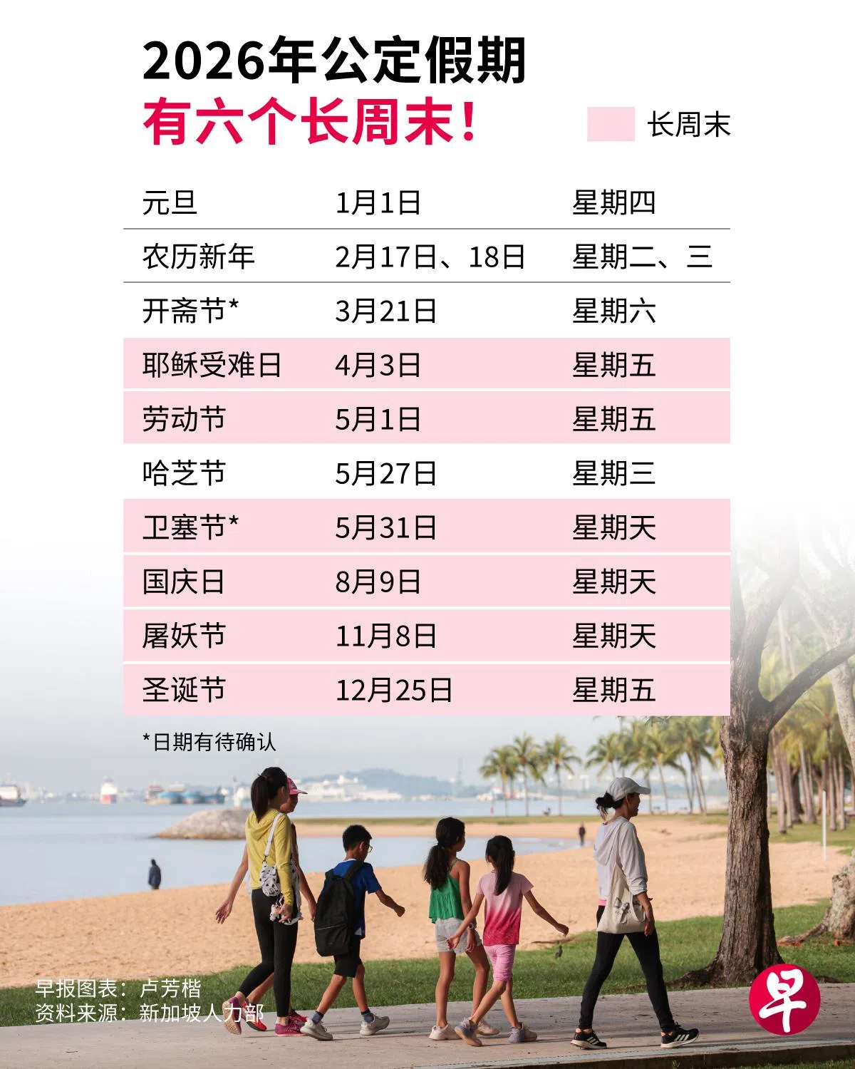 在2026年的11个公定假日中,公众将可享有六个长周末,包括耶稣受难节、劳动节、卫塞节和屠妖节。