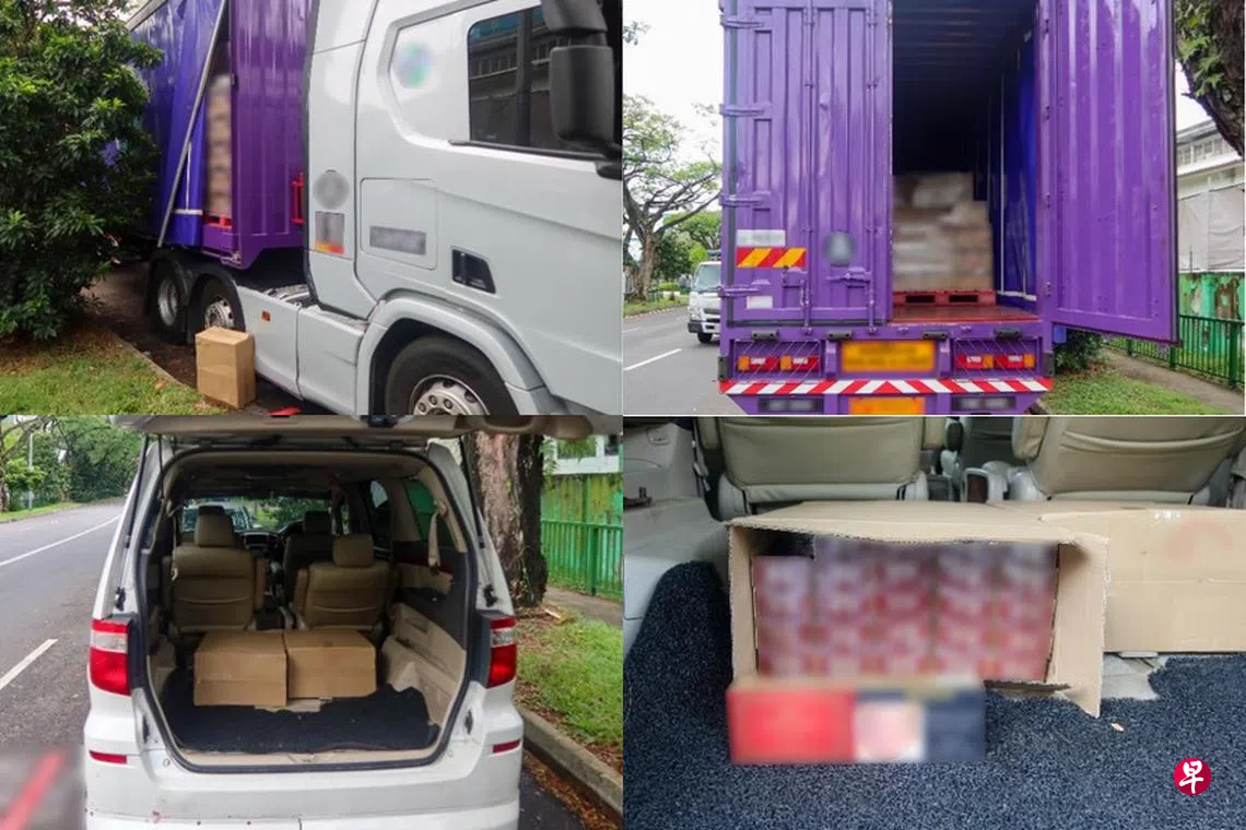 关税局指出,执法人员暗中观察,发现一辆马来西亚注册多用途汽车(MPV)和一辆马来西亚注册货柜车停在路旁,三名男子正在两辆车之间搬运箱子。