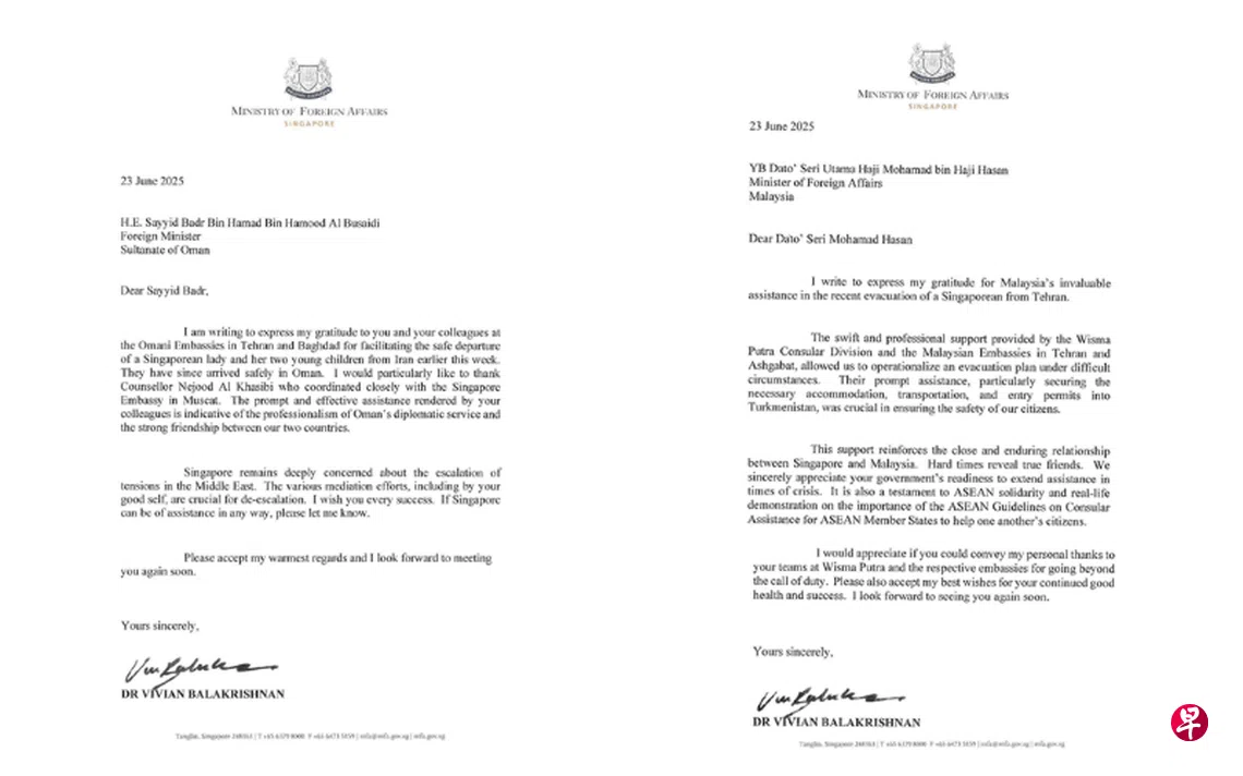 在给阿曼外长巴德尔(Sayyid Badr)的信中,维文感谢巴德尔,以及阿曼驻伊朗德黑兰和伊拉克巴格达的大使馆人员,协助一名新加坡妇女和她两名年幼的孩子,本周稍早撤离伊朗。他们目前已安全抵达阿曼。