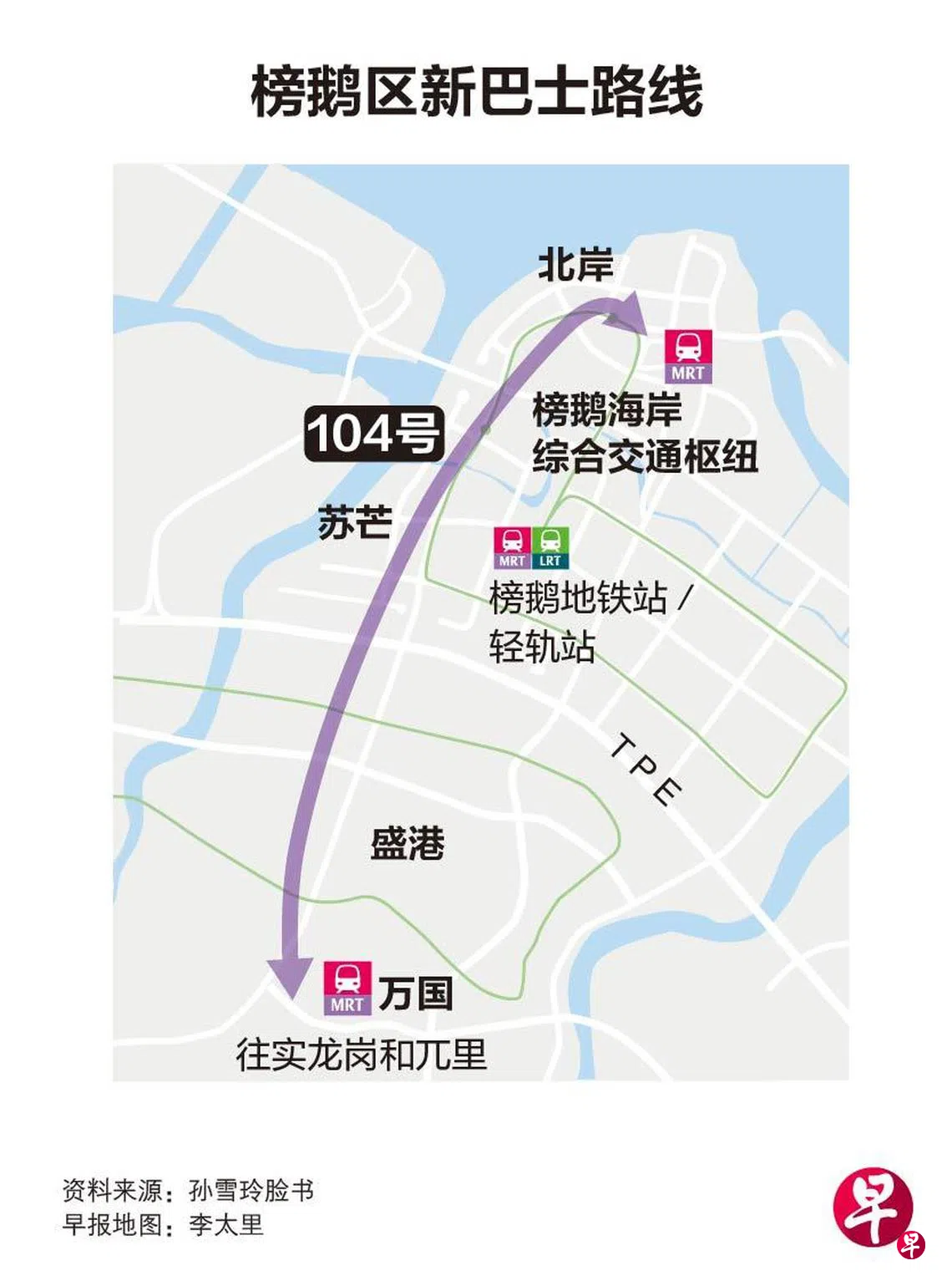 榜鹅集选区议员孙雪玲星期二(6月24日)在脸书贴文说,居民希望区内有更完善巴士服务,当局听到反馈后将在接下来几个月推出新的巴士路线104号,让榜鹅区居民能乘巴士直达盛港、万国、实龙岗和兀里,无须转车。孙雪玲也是国家发展部兼交通部高级政务部长。