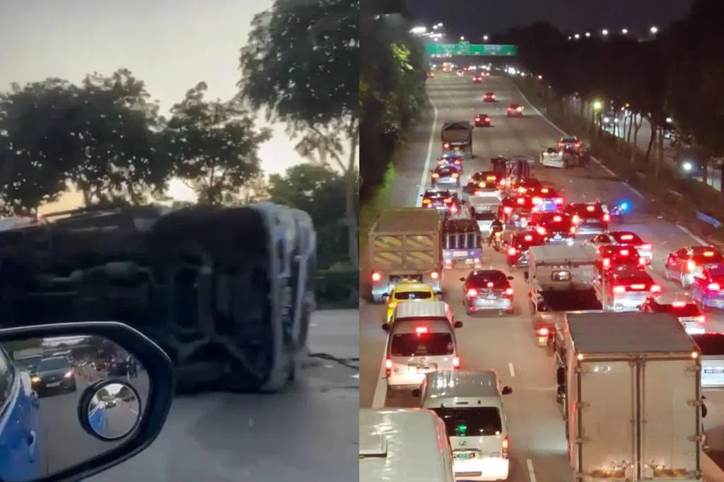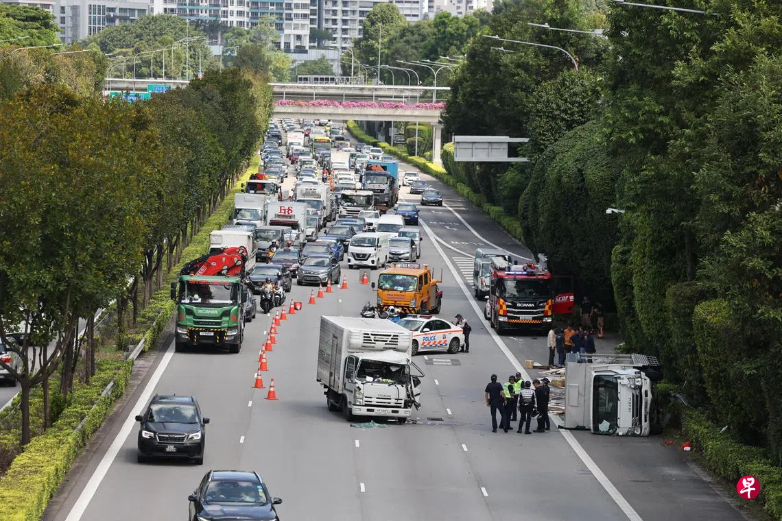 根据现场照片,一辆罗厘在第四条车道外,朝右侧翻,不远处另一辆罗厘的车头因擦撞受损,可见警车、消防车、拖车等在旁待命。执法人员随后放置交通锥警示后方车辆。由于只剩一条车道能通行,交通一度拥堵。