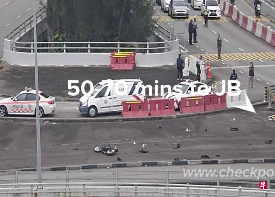 不少网民自星期六下午在社交媒体发文指大士关卡前的路段发生事故。也有网民截图手机应用Checkpoint.sg的画面,当中可见出境车道暂时关闭,一辆电单车倒在路上。