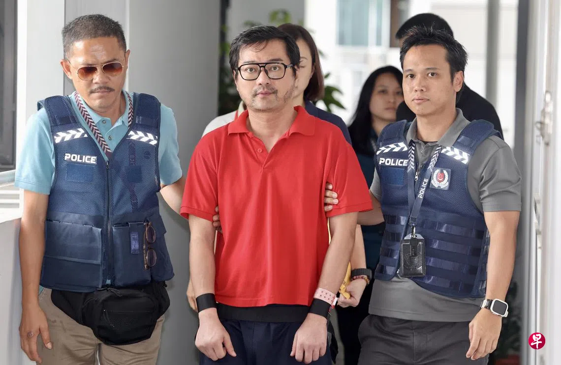 被告蓄短发,戴黑框眼镜,穿着红衣短裤和一双透明人字拖鞋。从组屋下车点下车后,手脚被拷的被告神情凝重,跟随警员乘坐电梯到事发单位协助警方调查,腿脚似乎不利索。
