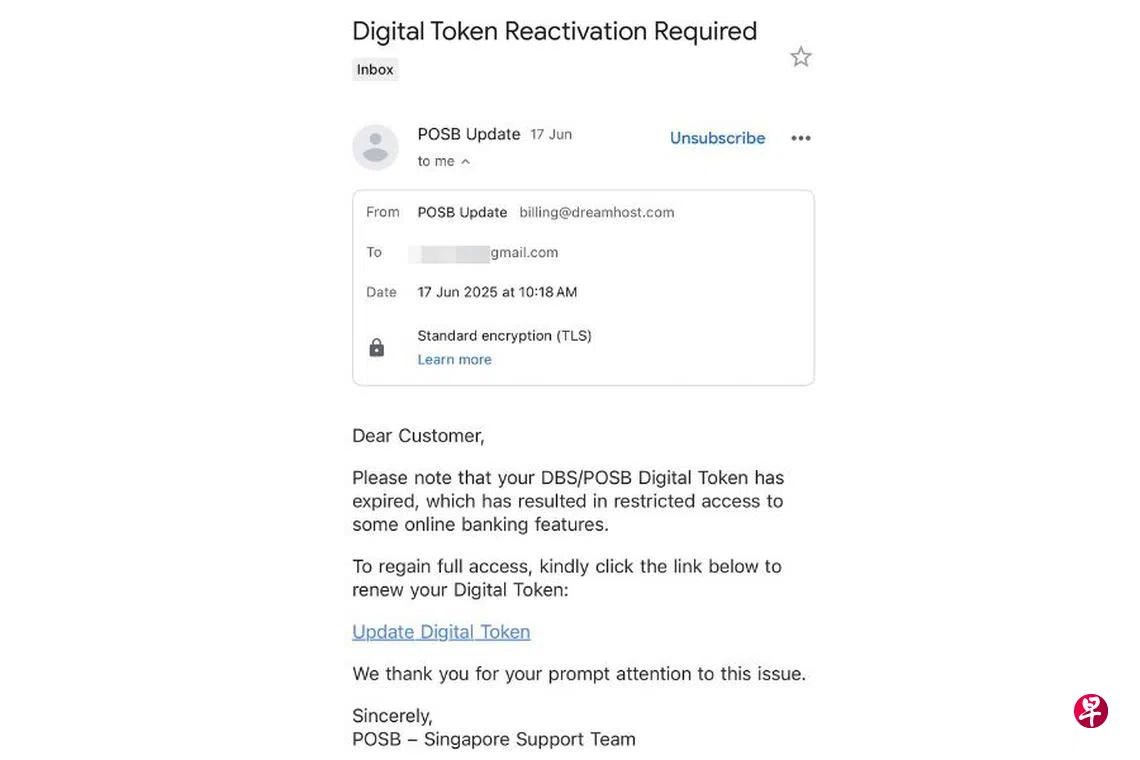 读者林女士(42岁,销售经理)告诉《新明日报》,她在6月17日收到一封标题为“储蓄银行更新”的电邮,提醒她需更新数码认证(Digital Token),否则将无法继续使用网上银行服务。