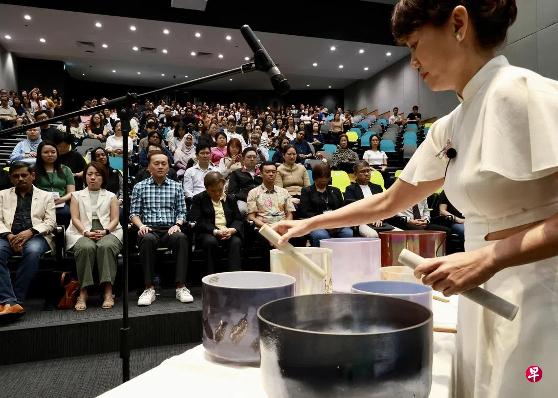 来自不同机构的代表分享了各种关于青少年心理健康的课题,其中一位导师现场展示何为“宝石钵音频治疗”,通过宝石钵发出音波帮助参加者放松身心,让他们在高压的生活中得到些许宁静。心理卫生学院精神科高级顾问兼发育阶段精神病学主任林春源医生,则分享了几种比较常见的青少年心理健康问题。