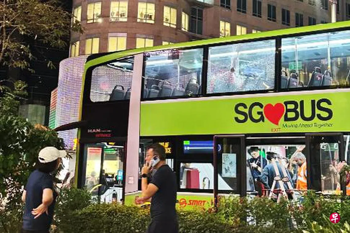 一辆SMRT营运的双层巴士在乌节路发生事故,上层车窗玻璃疑遭人抛掷瓶子,导致玻璃出现一个拳头大小的破洞,玻璃也破裂成蜘蛛网状,一人受伤送院。