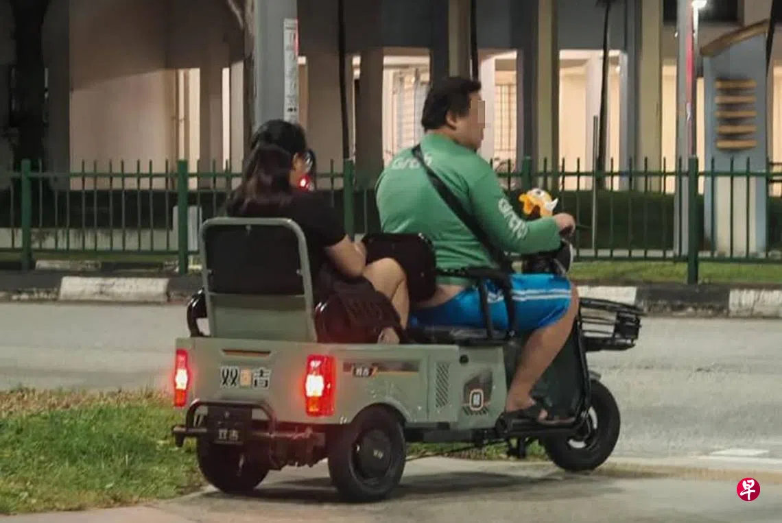网民“Akira Heng”星期四(7月3日)下午2时52分,在脸书上载一张类似“三轮车”的照片。照片中可见,一名穿着Grab上衣的男子骑着“三轮车”,后座还有一名女子。拍摄地点看似是在某组屋楼下的走道。