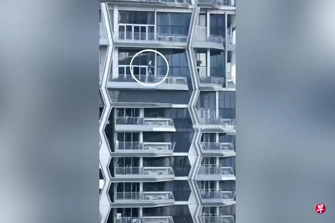 这惊险的一幕相信发生在滨海湾一带珊顿云尚(V on Shenton)公寓顶楼的一个住宅单位。