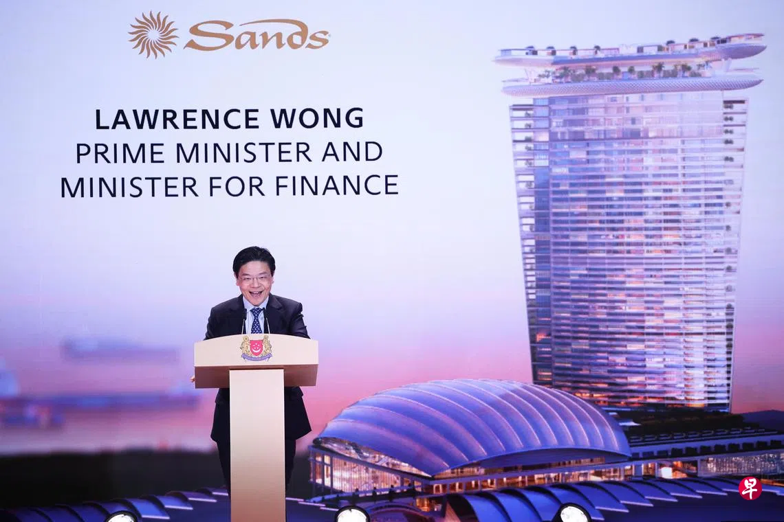 黄循财总理星期二傍晚为滨海湾金沙扩建项目——综合度假胜地2(简称IR2)主持动土仪式。他致辞时说,这个扩建项目是南部濒水区发展的一部分,从滨海东横跨至巴西班让,南部濒水区面积是滨海湾的六倍,未来可能增添更多商业项目,以及新的休闲和娱乐设施,同时也会建造新的住宅项目,包括政府组屋。