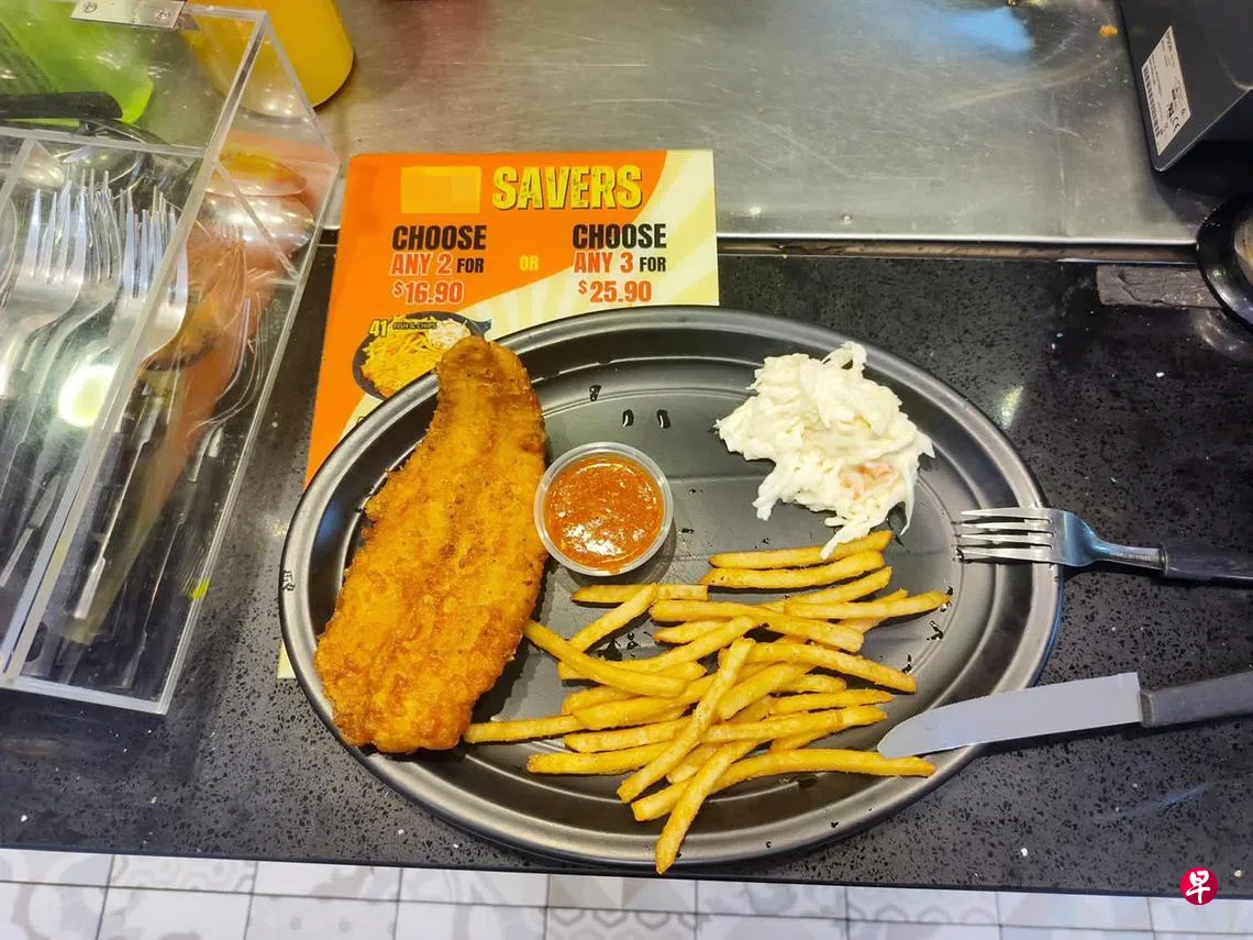《新明日报》记者走访摊位时,同样买了一份11元9角的炸鱼薯条,盘里的炸鱼比手掌大,沙拉不算多,但分量足够,至于薯条也不少。