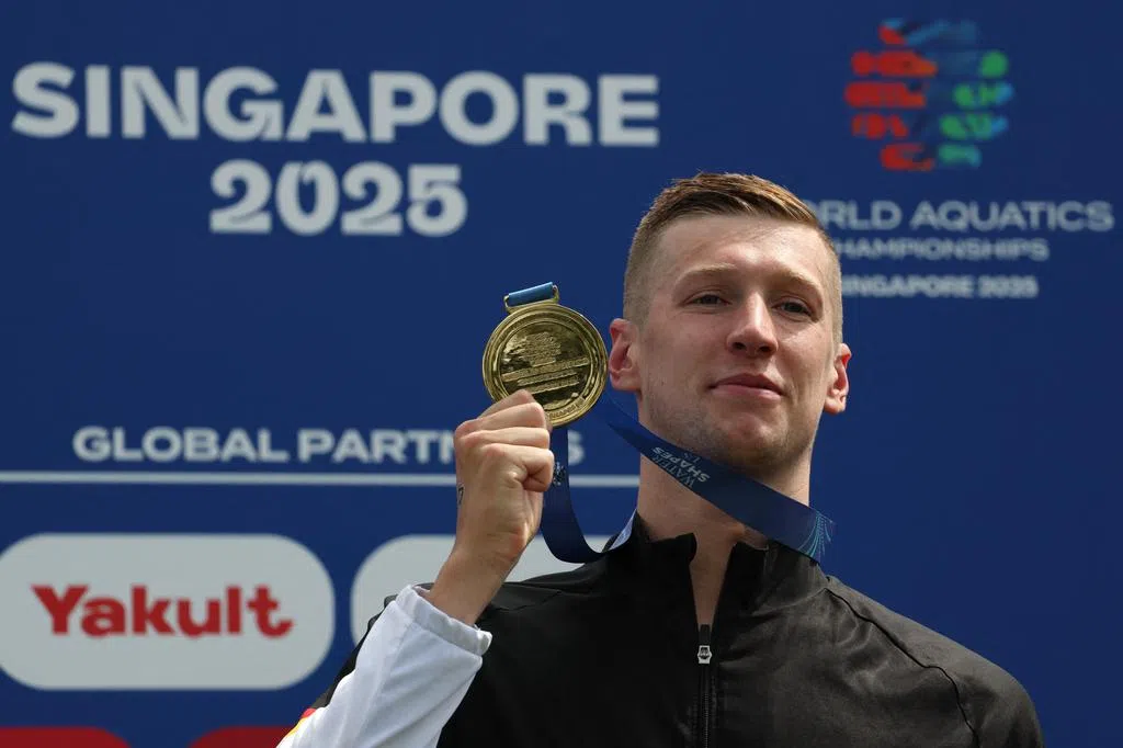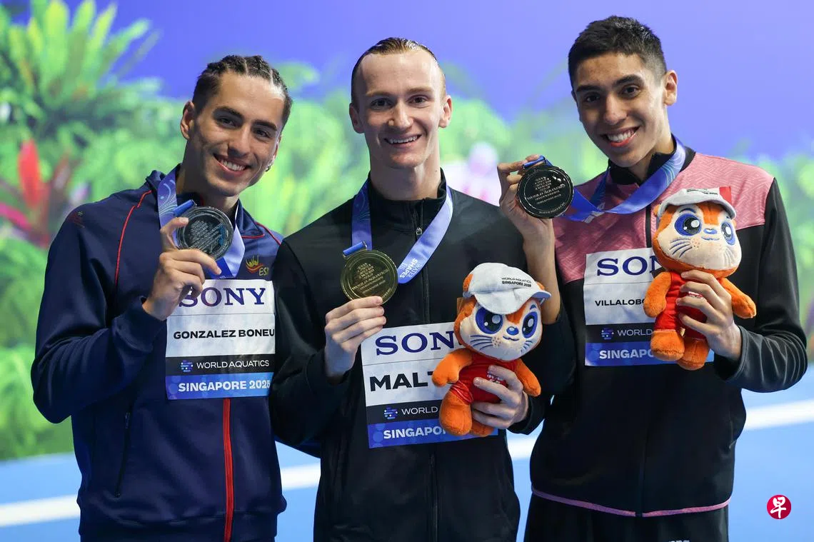 我国新建成的临时游泳设施世锦馆,星期六(7月19日)下午产生了首枚金牌,由俄罗斯男子花样游泳选手亚历山大·马尔采夫(Aleksandr Maltsev)在单人技术自选项目中夺得。