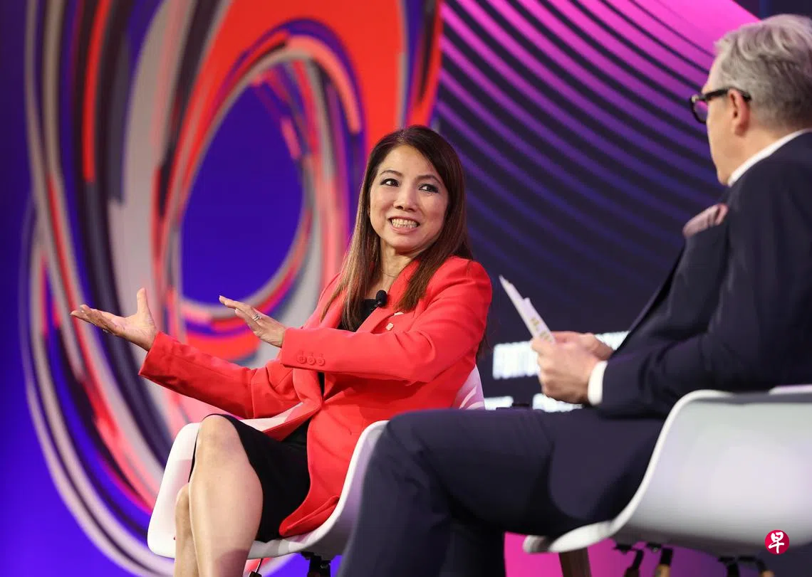 星展集团总裁陈淑珊星期三(7月23日)出席《财富》(Fortune)杂志和国际科技公司埃森哲(Accenture)联办的财富人工智能峰会(Fortune Brainstorm AI Singapore)时,与杂志亚洲版执行编辑钱德勒(Clay Chandler)进行对话。
