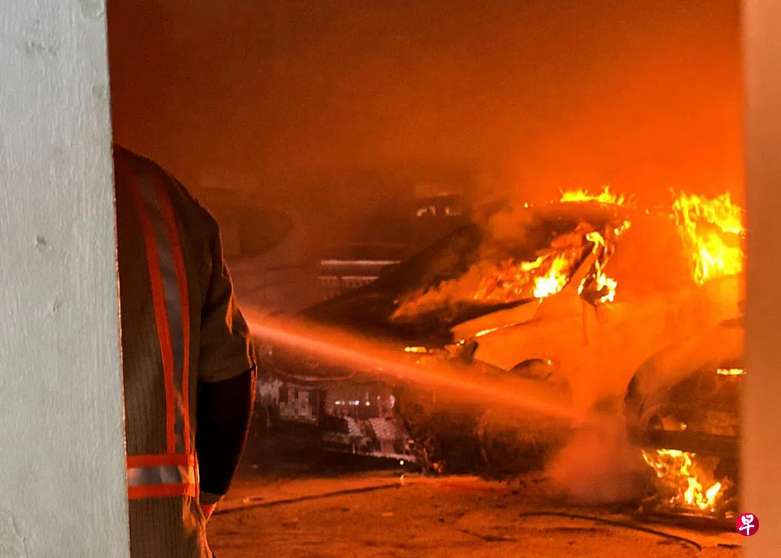 《联合早报》摄影记者抵达现场时,火势已被扑灭,失火车辆附近的墙壁被熏黑,现场弥漫着浓烈的烧焦味。