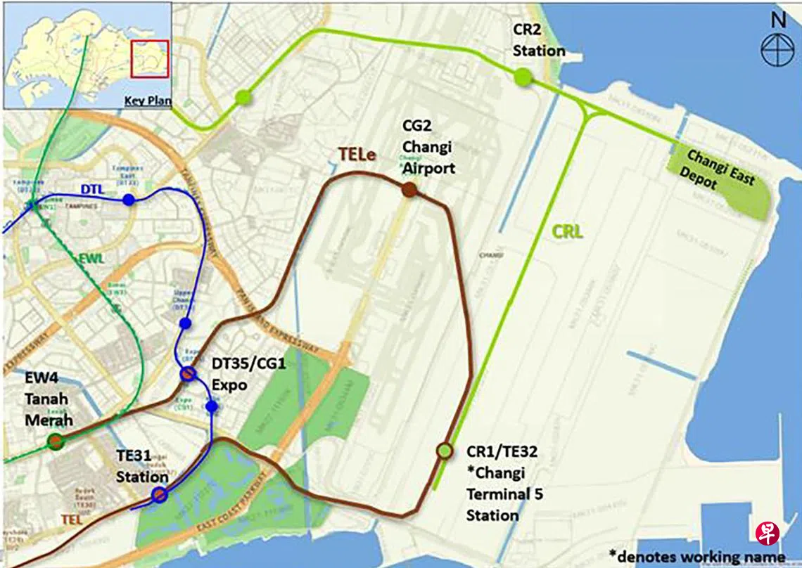 陆路交通管理局星期五(7月25日)发文告宣布,汤申—东海岸线将建造14公里的延长线(TELe),将双溪勿洛站衔接到新的樟宜第五搭客大厦(Changi Terminal 5,简称樟宜T5)转换站,再通往樟宜机场站、博览站和丹那美拉站。