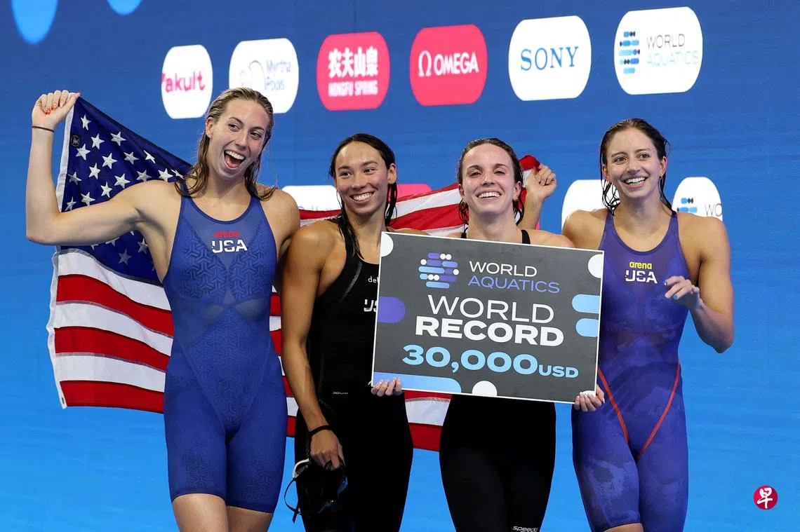 在星期天(8月3日)晚于世锦馆(WCH Arena)举行的水上运动世锦赛女子4x100米混合泳接力决赛中,美国队以3分49秒34夺冠,打破它在2024年巴黎奥运会创下的世界纪录(3分49秒63)。