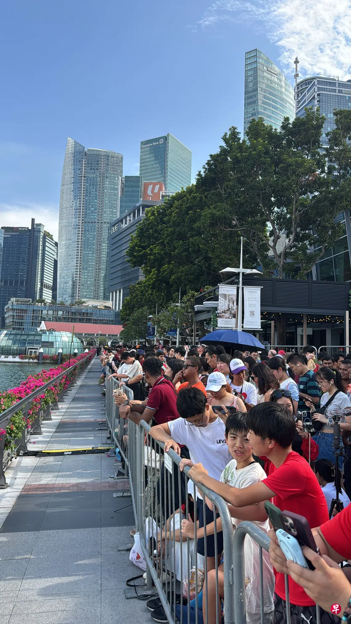 新加坡警察部队星期六(8月9日)下午4时56分在脸书发文说,由于滨海湾出现大量人潮,警方已停止人们进入鱼尾狮濒水区、富丽敦一号(One Fullerton)、金禧桥(Jubilee Bridge)、滨海艺术中心水滨(Esplanade Waterfront)以及前院(Forecourt)。