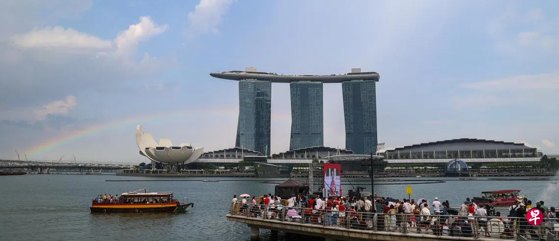 国庆庆典即将开始,滨海湾周围热闹非凡,人数预计已达数十万。今年庆典首次扩展至滨海湾一带,无法在大草场观看庆典的公众,对能够近距离参与其盛感到兴奋。