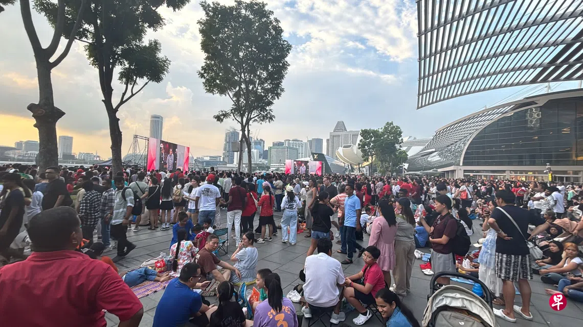 滨海湾一带欢庆国庆日的氛围浓烈,滨海湾金沙水滨一带因人潮拥挤而关闭。