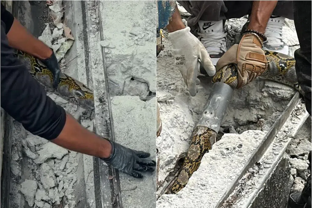 德惠巷咖啡店惊见3米长巨蟒,公众合力用扫把及椅子“摆阵”困蛇,阿叔英勇徒手擒拿。
