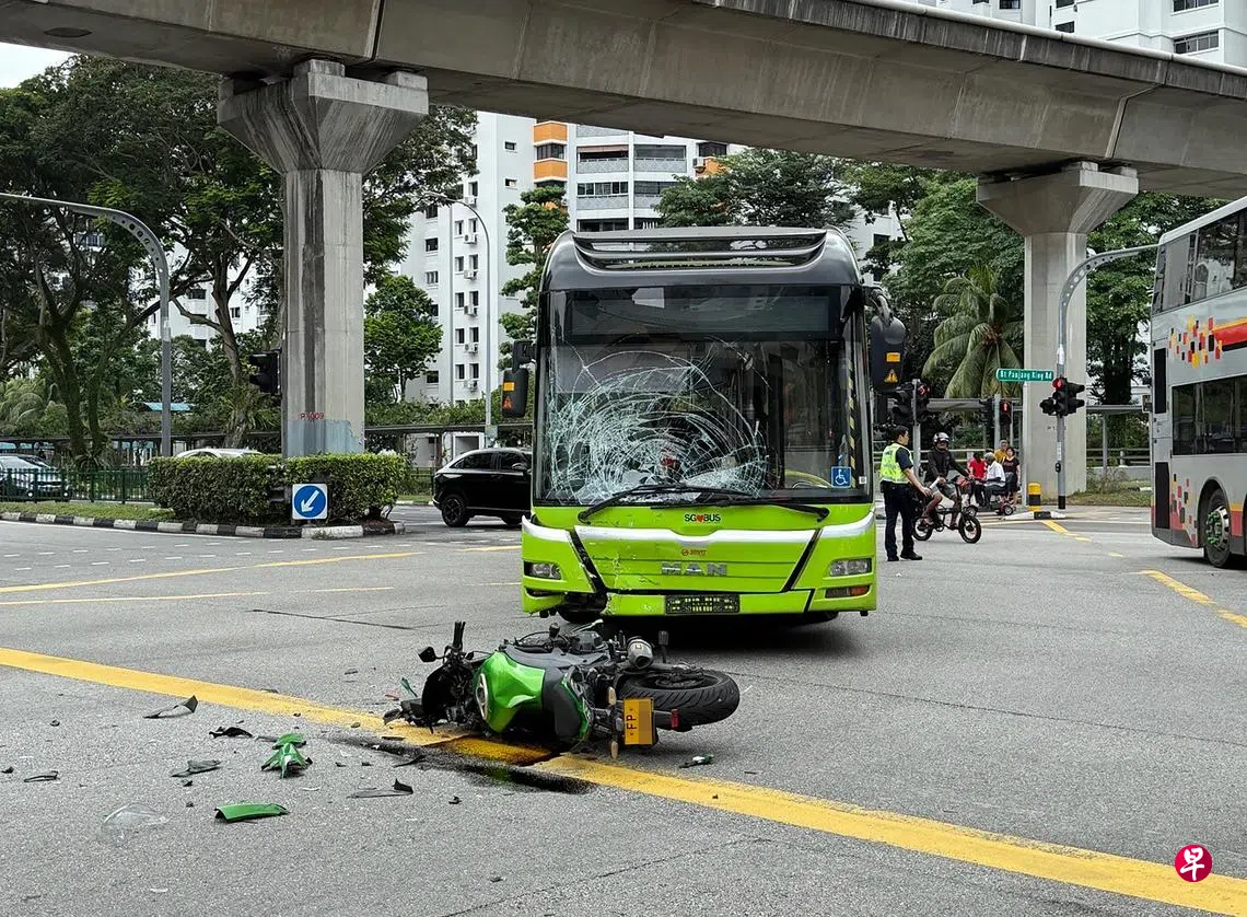 武吉班让大厦外发生车祸,一辆巴士与电单车相撞,导致巴士挡风玻璃破裂,骑士送院,巴士司机协助调查。