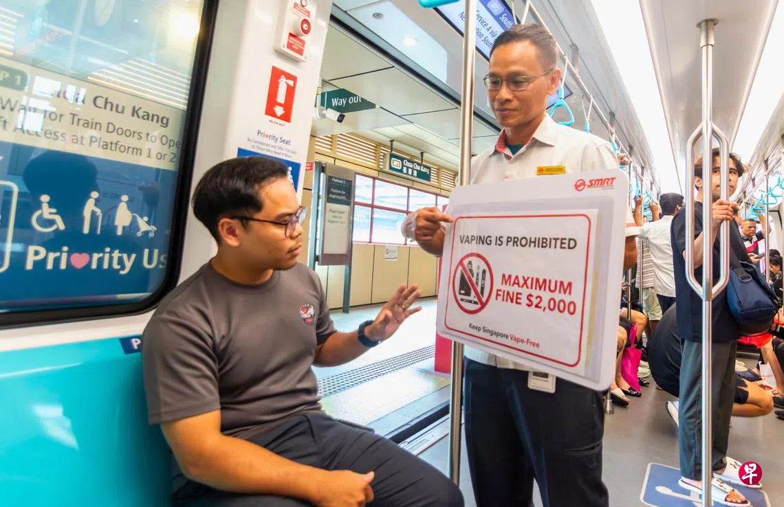 根据SMRT贴文,站务人员会在地铁月台和车厢内举牌提醒乘客,公共交通全面禁止吸食电子烟。地铁站闸门等显眼位置也会张贴告示。