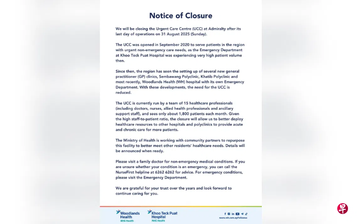 兀兰医疗机构星期二(8月18日)在社交媒体发文说,海军部(Admiralty)紧急护理中心(Urgent Care Centre)将开放至8月31日(星期天)。紧急护理中心2020年9月投入运作,目的是为北部地区的非危急病患提供及时护理,以应对邱德拔医院紧急部门病人量高的情况。