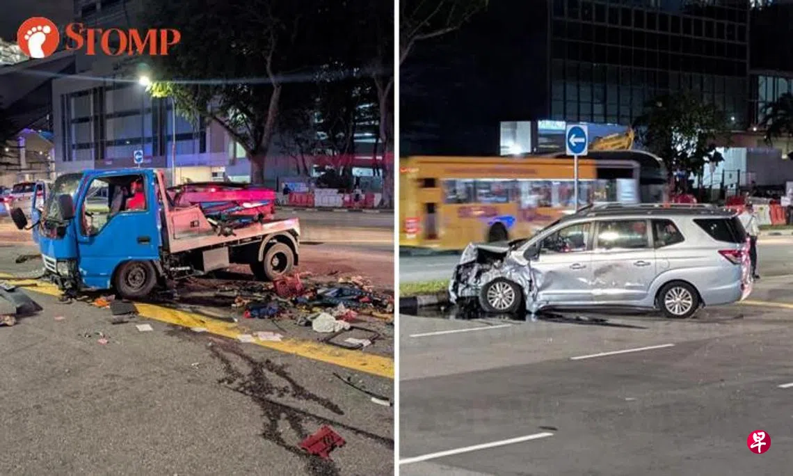 网民罗伯特在车祸发生后经过现场,拍下现场画面发给公民记者网站STOMP。视频中可见,一辆银色汽车车头严重损毁停在路上,不远处则有一辆蓝色拖车,车头严重损坏,零件散落一地。