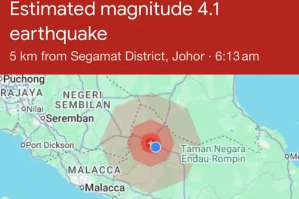 马来西亚柔佛昔加末清晨发生4.1级地震,新加坡驻吉隆坡最高专员公署和驻新山总领事馆提醒新加坡人保持警惕,遵循柔佛州政府的建议,注意当局指示,包括远离不稳固的建筑物。