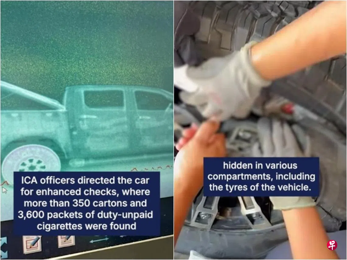 执法人员在进一步检查这辆可疑汽车时,在车子的多个夹层和车胎内发现了超过350条和3600包漏税香烟。