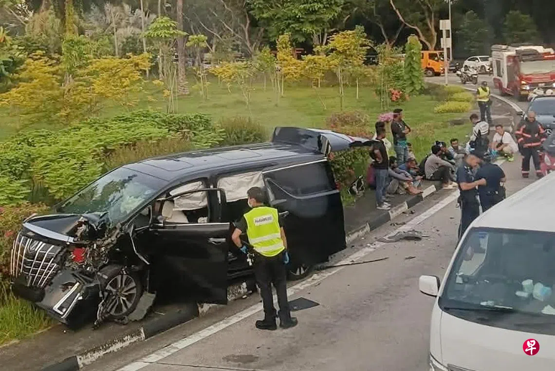 根据读者提供的照片,一辆车头严重损毁的丰田埃尔法(Alphard)豪华休旅车停在路旁草坪上,车上的安全气囊弹开。车后方则有至少九名客工蹲坐在路肩等待援助。附近还有一辆民防车辆。