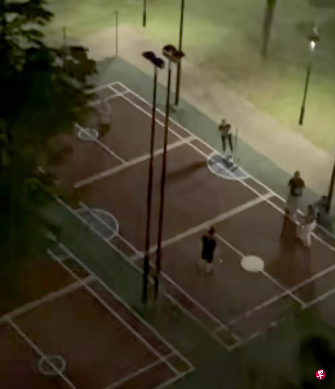 根据她的视频,有大约六人聚集在组屋楼下的羽毛球场,其中三人在打匹克球。视频中也可以清晰地听到打球声。