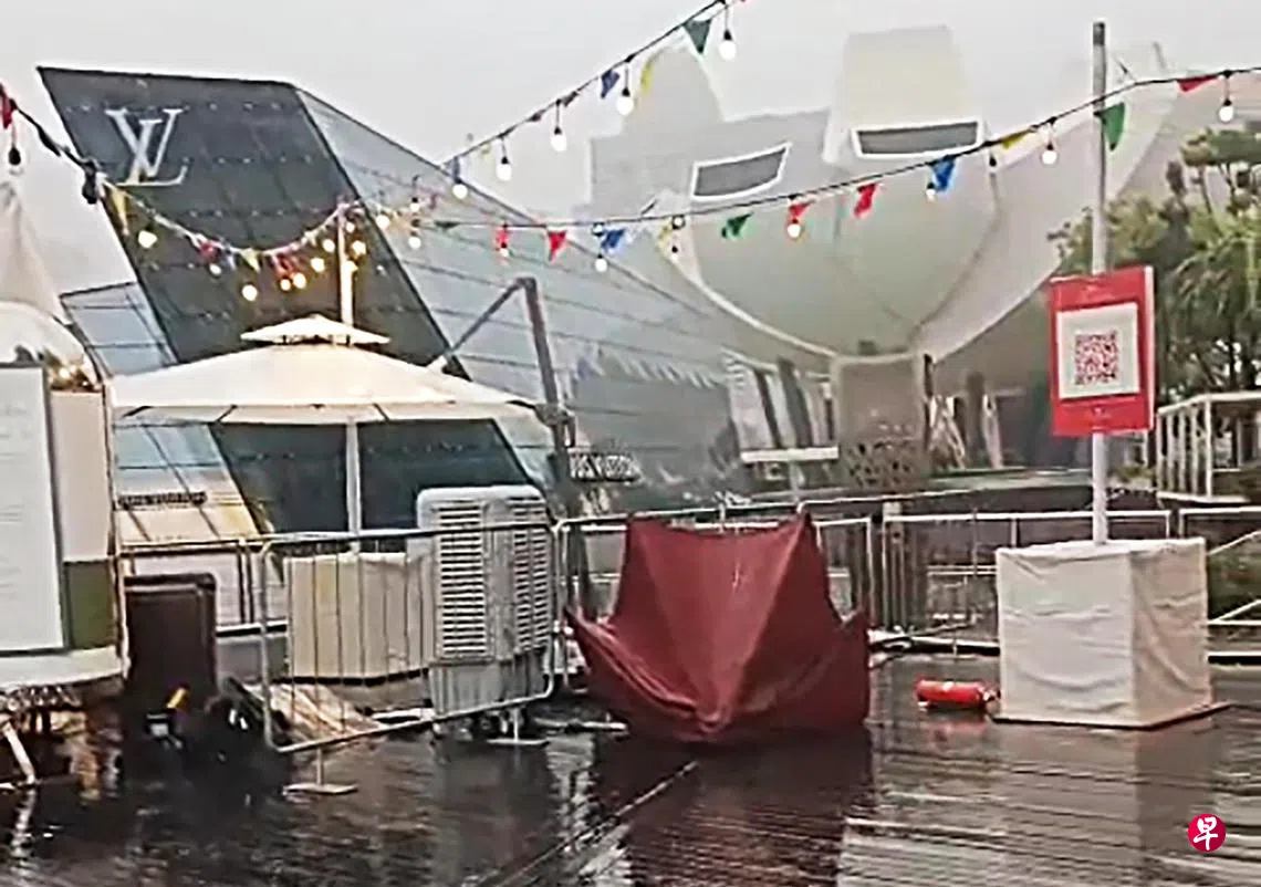 根据视频,事发时仍下着大雨,供食客堂食的桌椅被狂风掀翻、散落各处,两三把遮阳伞也被吹得东倒西歪,就连部分围栏也被吹倒。
