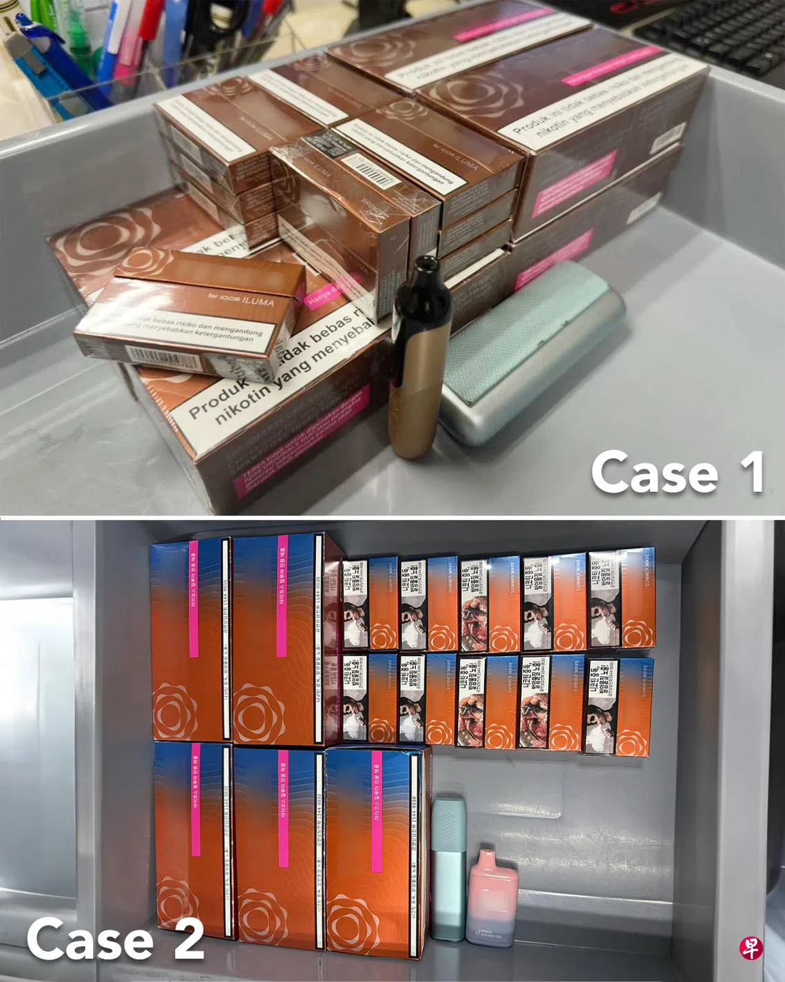 移民与关卡局一天内破获两起企图走私案,从两名外籍旅客身上搜出近2400支加热烟草(heat-not-burn tobacco),以及四支电子烟。