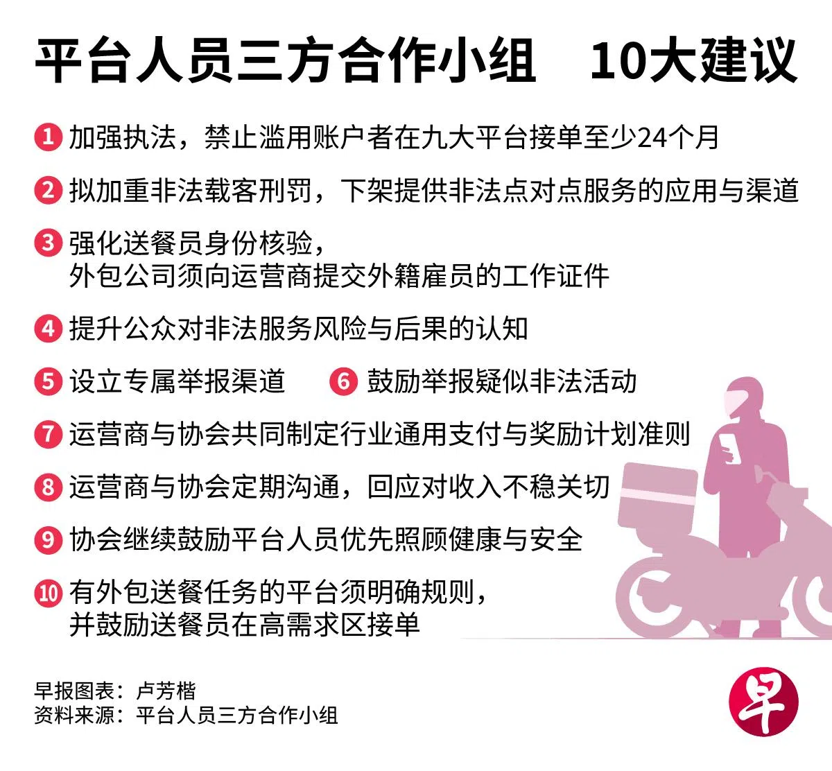 首六个建议聚焦加强执法和提高公众认知,例如鼓励平台人员和公众举报疑似非法行为,平台运营商若怀疑有平台人员让外籍人士使用个人账户接单,也应上报人力部。