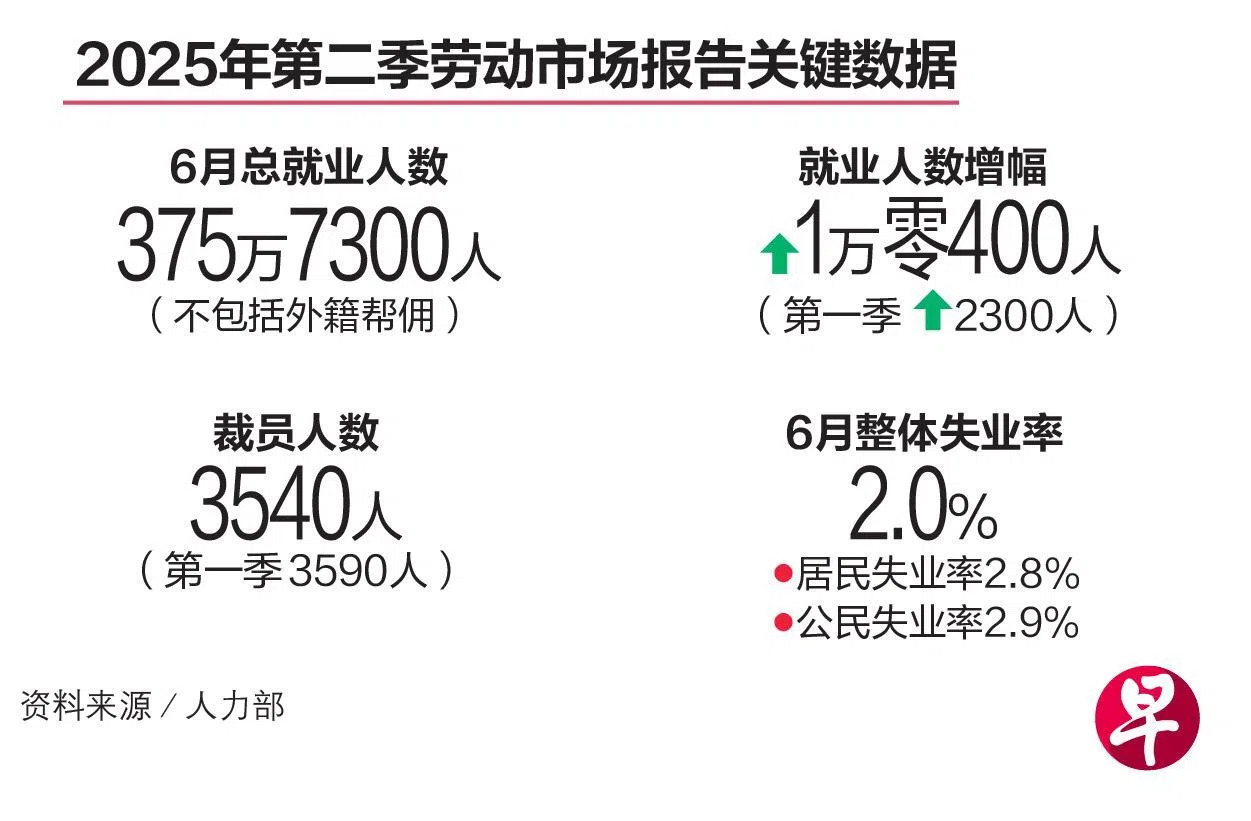 人力部星期三(9月17日)公布2025年第二季《劳动市场报告》数据,就业人口增幅比第一季的2300人,大幅增加8100人至1万零400人,其中2600人为公民和永久居民。不包括外籍帮佣,截至6月的总就业人口达375万7300人。