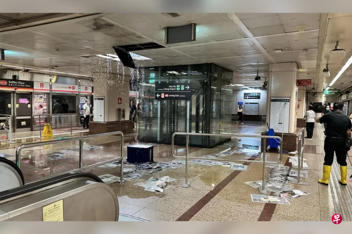 莱佛士坊地铁站月台的一块天花板面板脱落,水从天花板倾泻而下,部分区域被迫关闭。