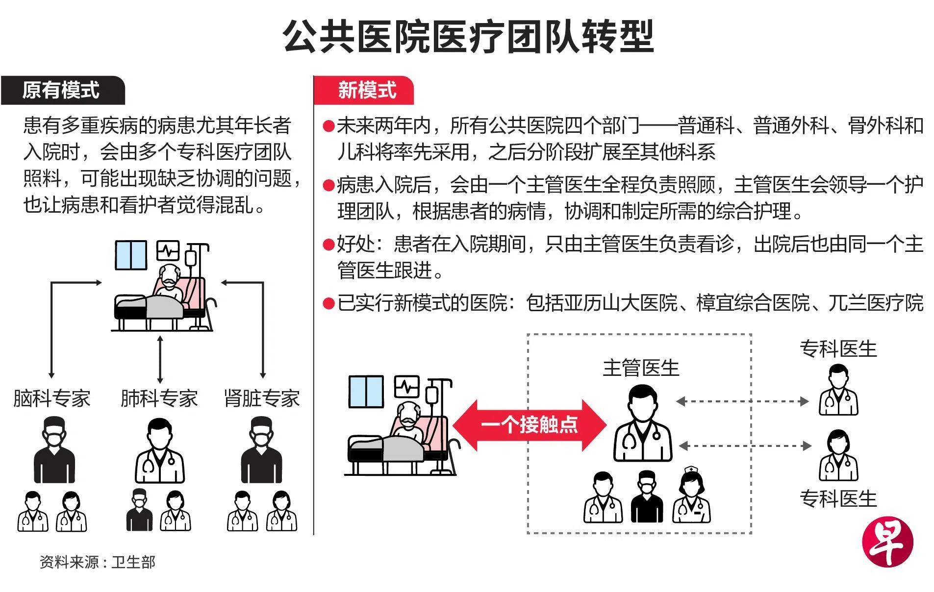 今年初,公共医院在几个特定科系,如普通科、普通外科、骨外科和儿科采纳了新的主管医生模式。患者入院时,院方会在分诊后根据患者病况,为他配对一名主管医生,负责协调和制定护理计划。主管医生可由专科医生或医院临床医生担任,并都具备广泛医疗专业知识和能力。若有必要,主管医生可向其他专科医生或医疗保健专员寻求治疗建议。