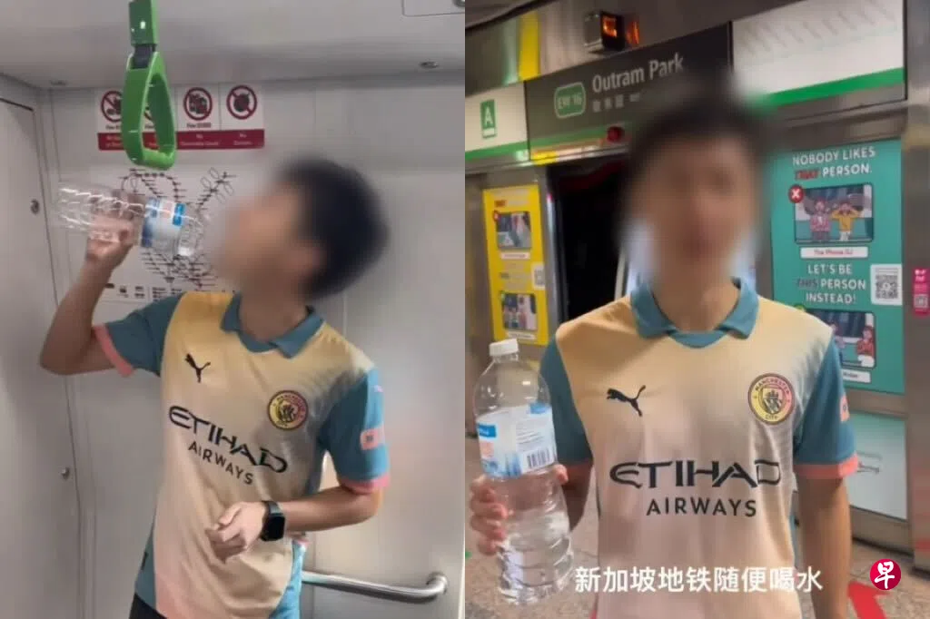 网上流传的一段视频中,这名年轻男子在裕华园站闸门前,用华语称将挑战地铁上禁止喝水的规定。他随后在地铁车厢内,指着注明禁止饮食和罚款500元的警示牌,然后大口喝了手中的矿泉水,还对镜头比赞。视频结束前,他在欧南园站的月台上说:“事实证明,新加坡地铁站(可)随便喝水。”
