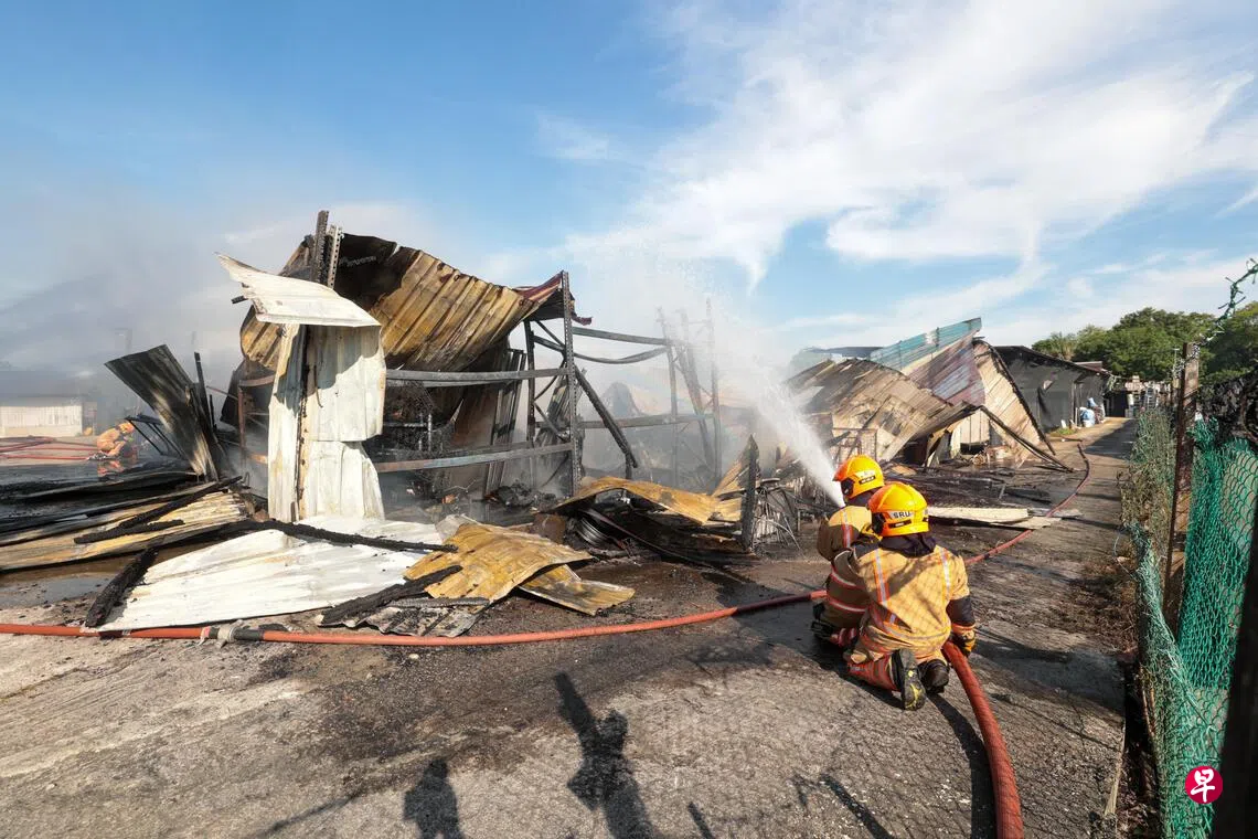 双溪登加路一渔场的储物棚发生大火,所幸无人受伤,新加坡民防部队正在进行浇湿工作。