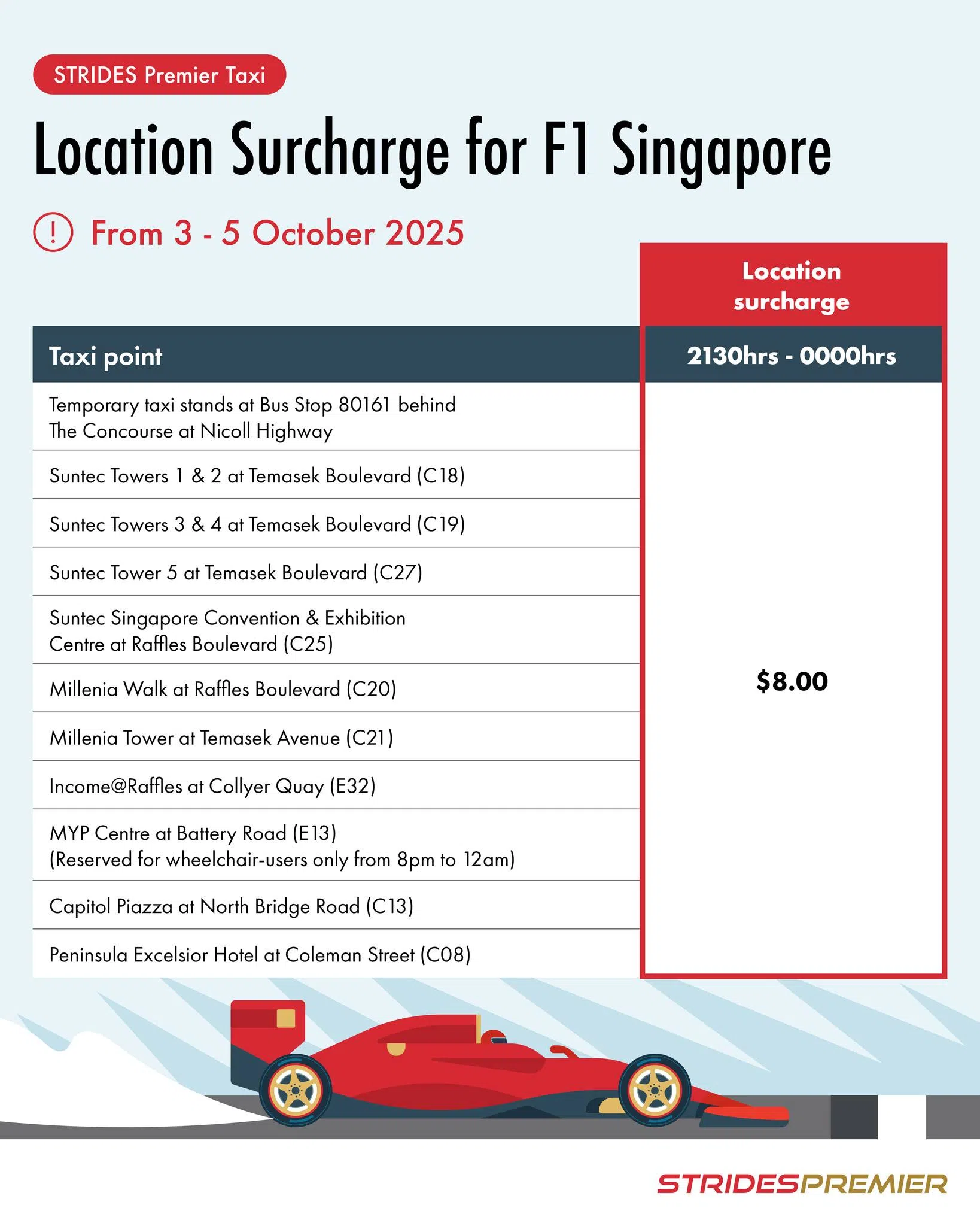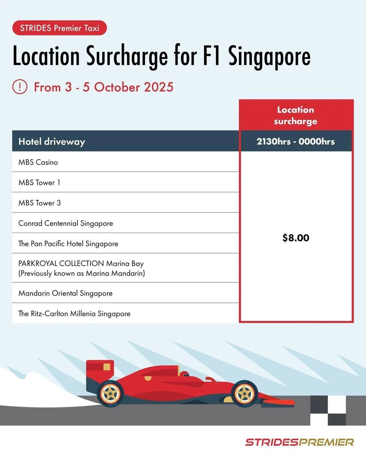 根据公司脸书上的列表,在这三天,晚上9时30分至凌晨零时,从F1赛道附近的11个德士站(包括新达城第一至五大厦及会展中心、美年径等),以及附近酒店八个地点:滨海湾金沙赌场、滨海湾金沙酒店一号楼和三号楼、 康莱德酒店、泛太平洋酒店、滨海湾宾乐雅臻选酒店、文华东方酒店,以及丽思卡尔顿美年酒店出发的行程都将收取附加费。