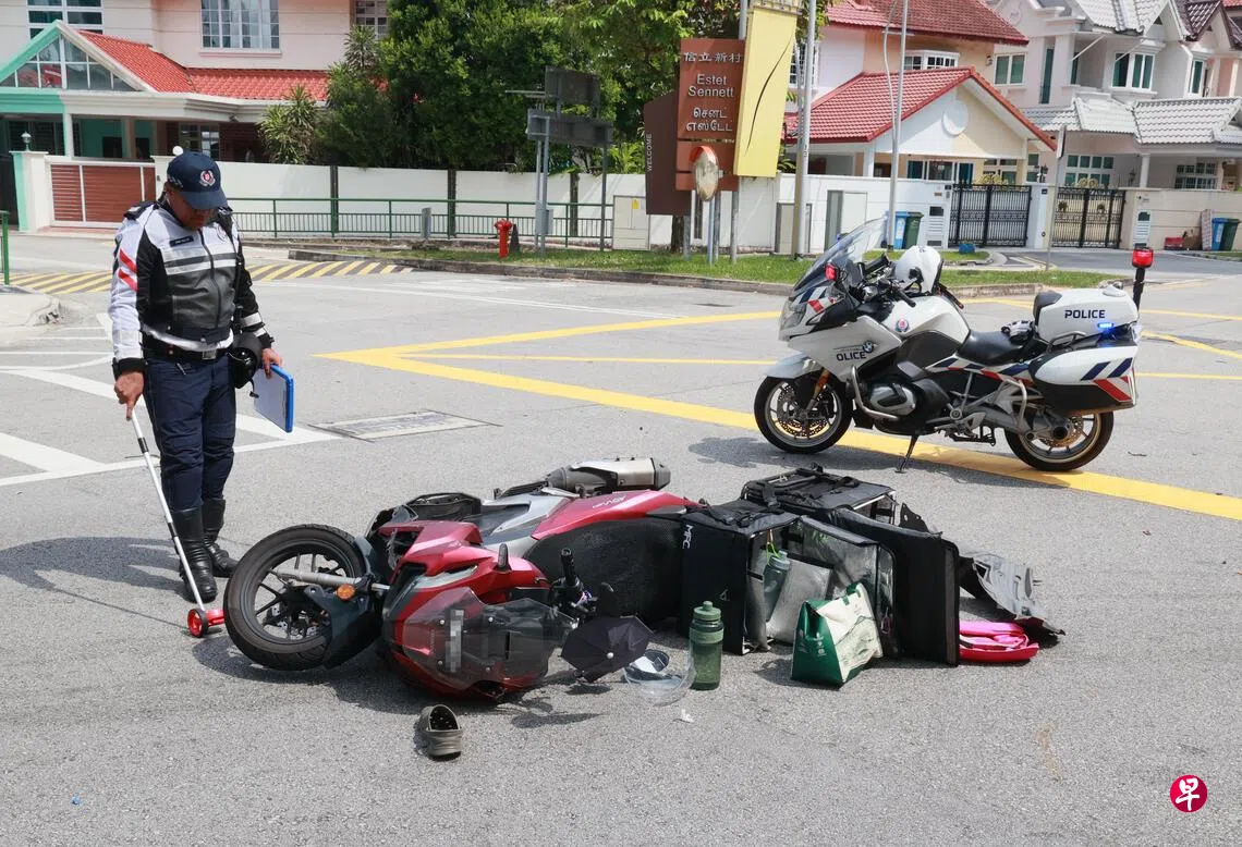 记者到场时,涉事的电单车倒在路口,送餐箱翻倒在地,不过箱内没有食物。一辆白色轿车停在不远处,左边的防撞杠脱落,部分轮胎外壳也损坏。