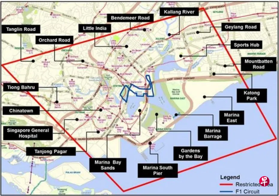 禁飞区以滨海湾F1大赛的赛道为中心点,受影响的地点和路段包括东陵路、乌节路、小印度、明地迷亚路、芽笼路、蒙巴登路、滨海堤坝、滨海湾花园、滨海南码头、丹戎巴葛、新加坡中央医院、牛车水和中峇鲁等。禁飞区从平均海平面延伸至空中4000英尺(约1219公尺)。