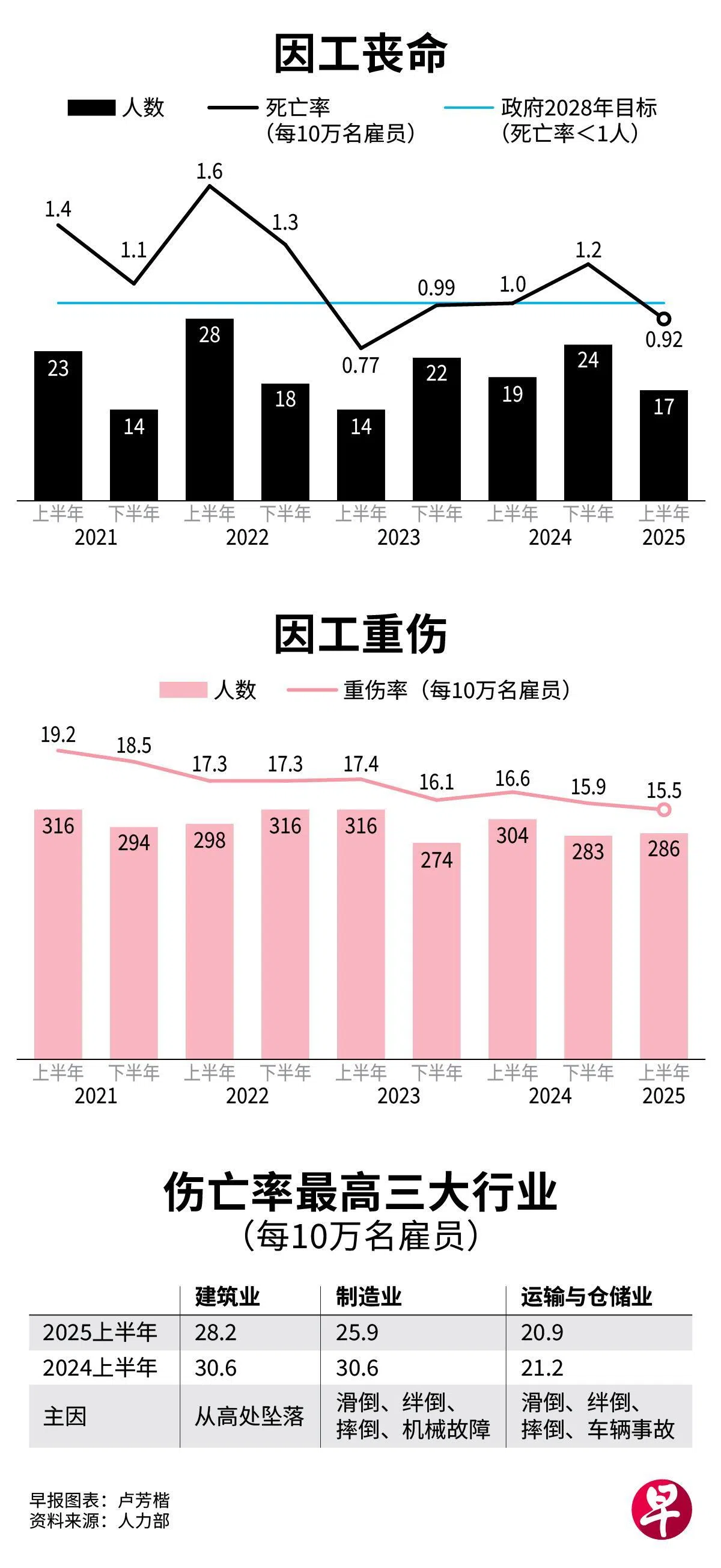尽管本地建设工程密集展开、客工人数持续增加,今年上半年因工伤亡的人数有所下降。按上半年数据推算全年,每10万名工人的工伤死亡率为0.92,是继2023年后再度回落到1.0以下。