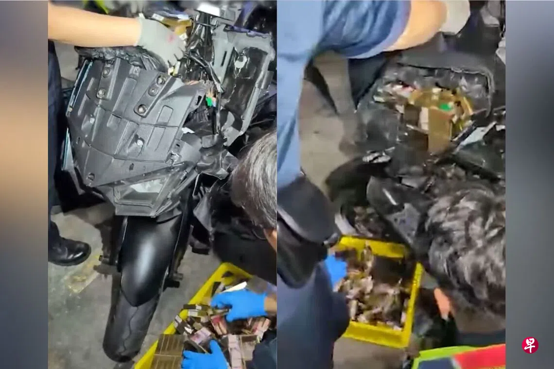 将400多包漏税烟藏匿于电单车整流罩,32岁马国骑士企图瞒天过海,被执法人员识破。