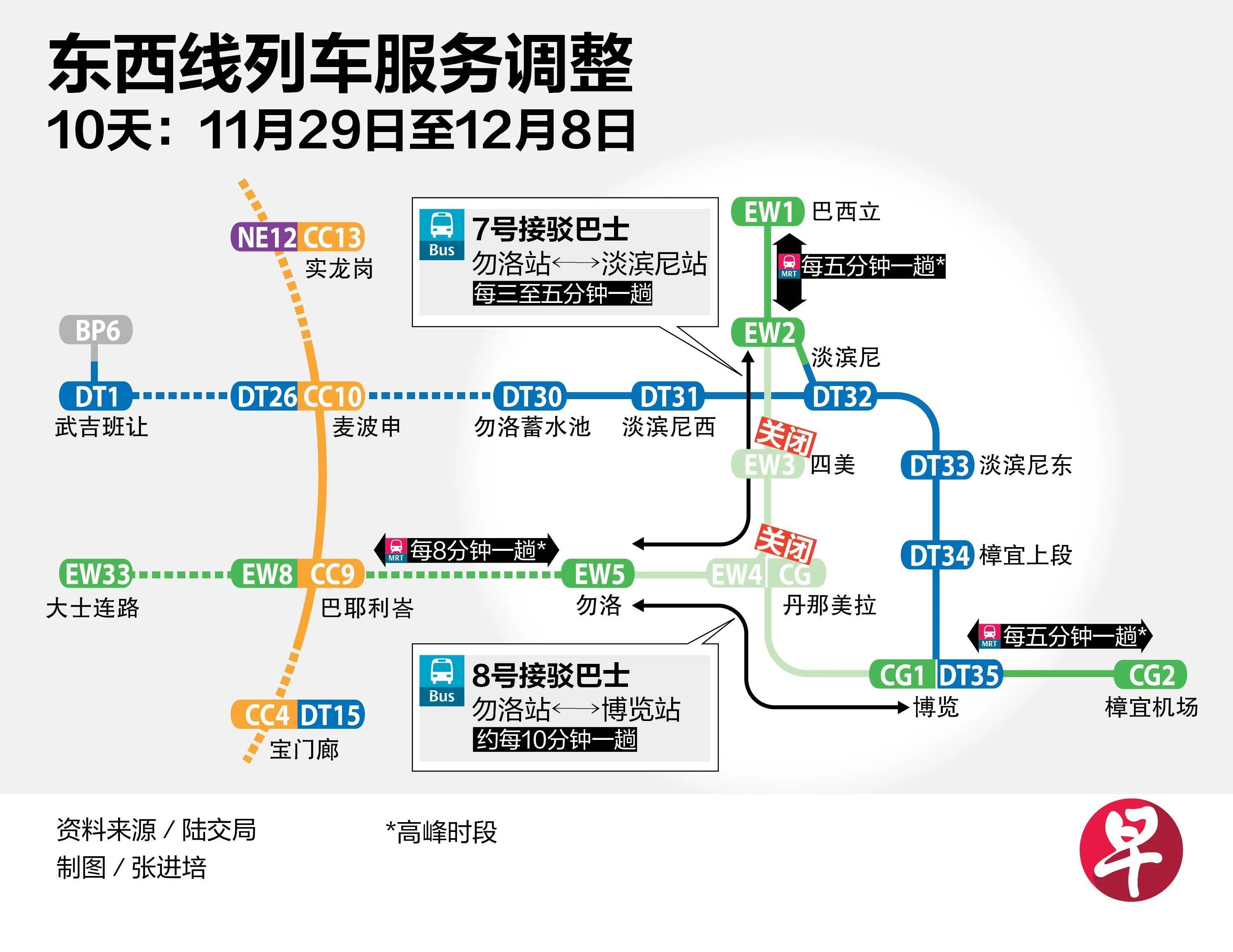 陆路交通管理局和地铁业者SMRT星期五(10月3日)发文告说,11月29日至12月8日,四美站和丹那美拉站将关闭,巴耶利峇站之后的东西线列车服务将分三段接驳列车运行: