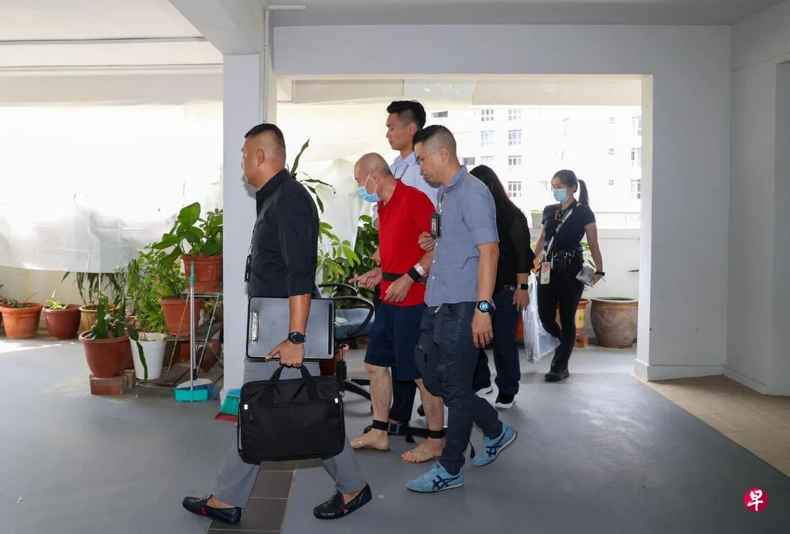 在组屋逗留一个半小时后,被告被押下楼,带回警车上。