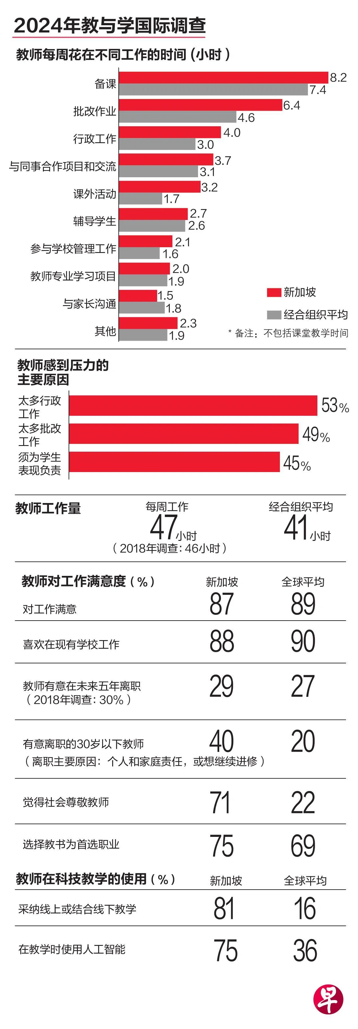 经济合作与发展组织(OECD)星期二(10月7日)公布2024年教与学国际调查(Teaching and Learning International Survey,简称TALIS),与上一轮的2018年调查相同,本地教师花在课堂教学的时间低于经合组织平均,反之,他们利用更多时间在备课和与团队策划、学生辅导、课程辅助活动等工作。教育部指出,这些工作同等重要,以确保为学生提供全面教育。